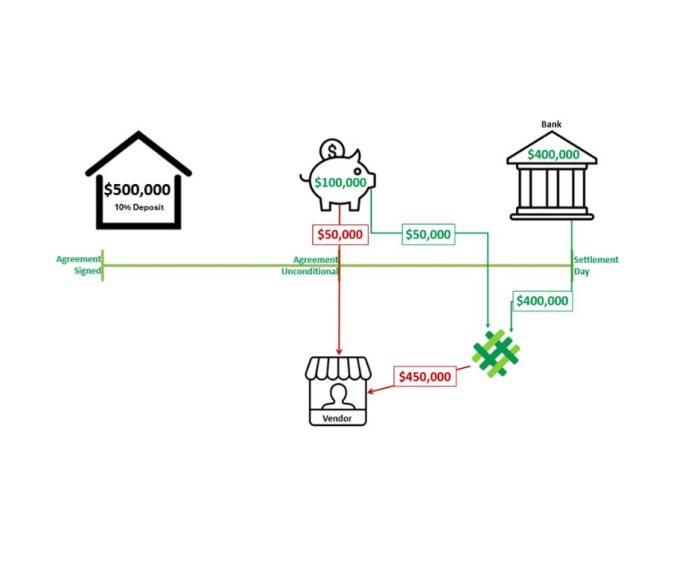 • On settlement day, the bank will pay the $400,000 loan to your lawyer. Once they have received the funds from the bank, they will pay the balance of the purchase price ($450,000) to the vendor’s solicitor.